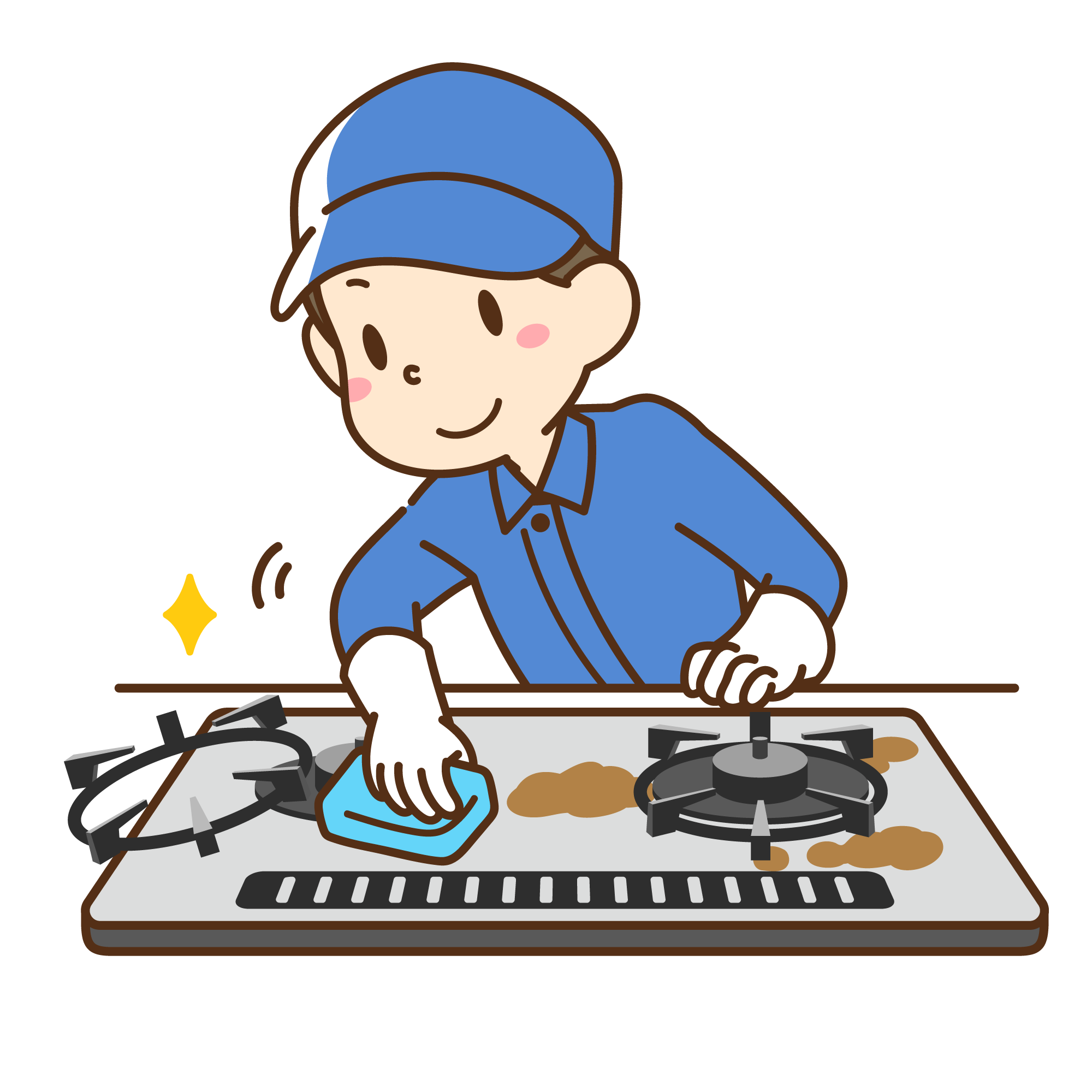 ガスコンロ表面洗浄(1台)、シンク含む流し台・蛇口などの洗浄(各1ヶ所)、吊戸棚・収納庫の表面洗浄(キッチン内)